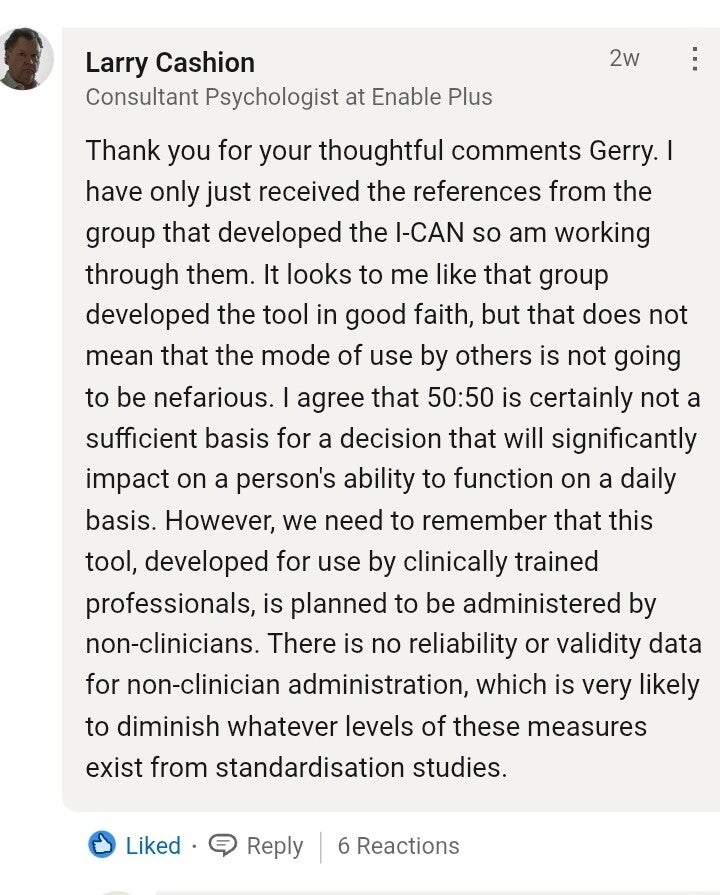 According to Larry Cashion, a Consultant Psychologist at Enable Plus who has reviewed the I-CAN, is of the opinion that the accuracy of the new assessment tool is likely to be even lower than 1 in 2 in the real world where it will be administered by non-clinicians: ‘There's no reliability or validity data for non-clinical administration which is very likely to (further) diminish (accuracy).’ In short, the accuracy of the I-CAN's, which is already unacceptably low, would be further reduced in a real world setting in unprofessional hands. NDIA plan on dispensing with allied health professionals entirely and assessing participants themselves, using bureaucrats who have no allied-health training whatsoever. This controversial decision throws the accuracy of the I-CAN as an assessment tool on NDIS into further question.